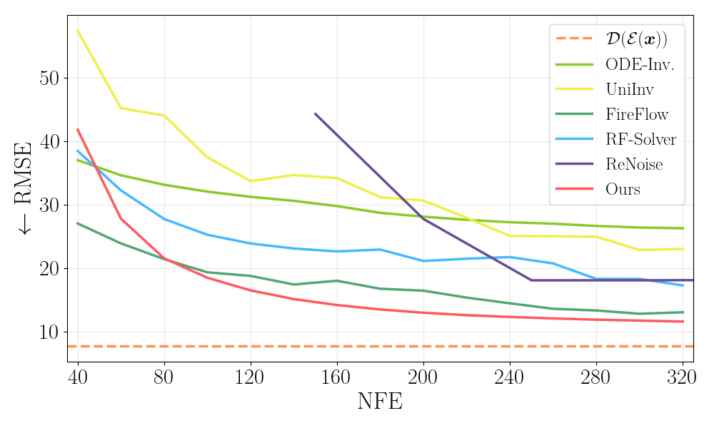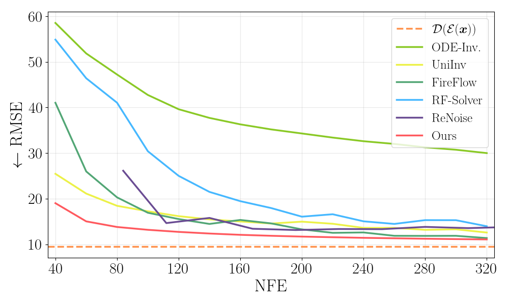 The following figures demonstrate the reconstruction quality of FlowOpt for the inversion task for both FLUX and Stable Diffusion 3 (SD3), compared to other methods as a function of the number of NFEs, where the RMSE is an average over a dataset:
