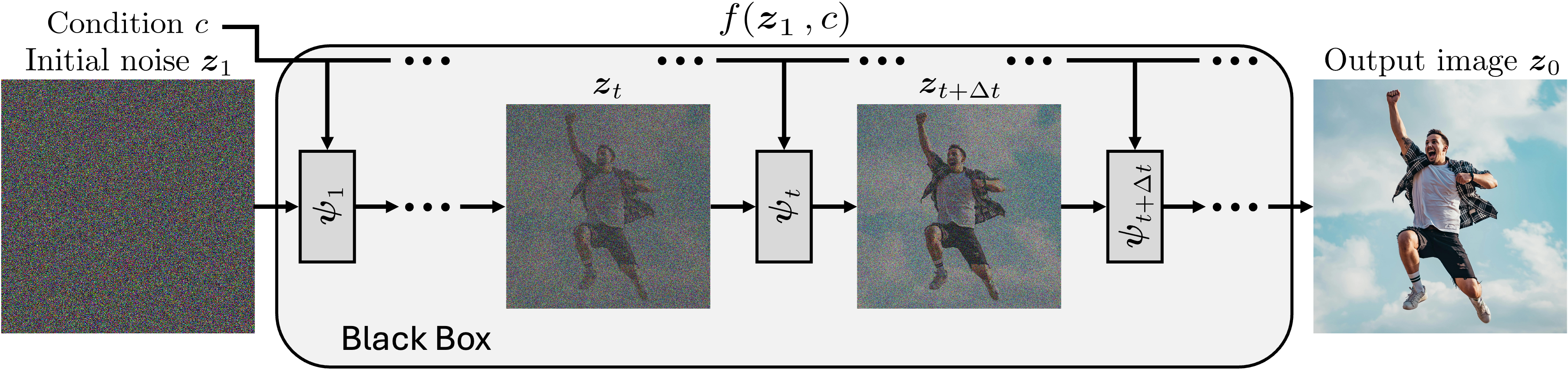 This function accepts an initial noise map \(\boldsymbol{z}_{1}\) and optionally a text prompt \(c\) and generates the image \(\boldsymbol{z}_{0}\)