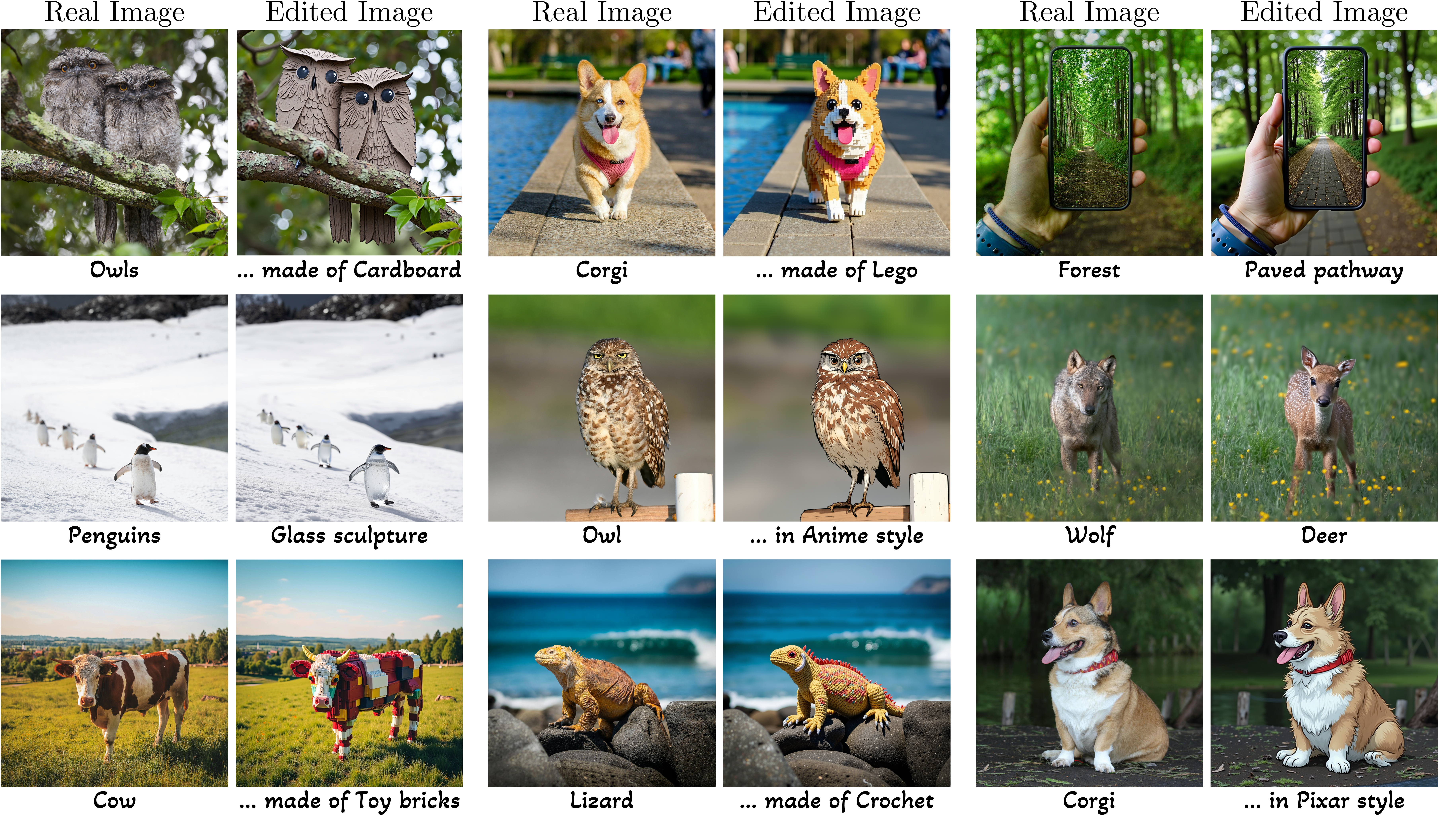 inversion (recovering the initial noise \(\boldsymbol{z}_{1}\) that causes the flow process to generate the image \(\boldsymbol{y}\) when the text \(c\) describes that image) and